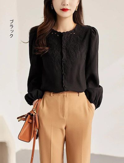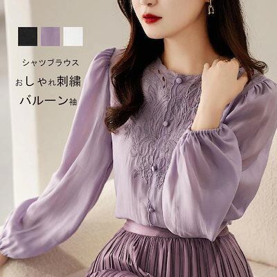 刺繍ブラウス長袖レディースシャツトップスフリル襟シャツブラウスノーカラーバルーンスリーブゆったり前開きボタンおしゃれ薄長袖tシャツ羽織り羽織る春夏304050通勤フォーマルオフィス仕事黒白紫