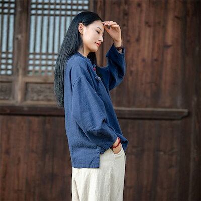 ブラウスチャイナ風レディース綿麻シャツトップスナチュラルチャイナカラー長袖リネンブラウストップス無地シャツスタンドカラーチャイナボタンゆったりナチュラル秋大人かわいいおしゃれカジュアルエスニックチャイ