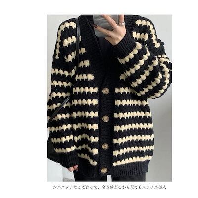カーデ レディース カーディガン 厚手ニット ボーダー ゆったり ニットカーディガン Vネック 厚手 白黒ボーダー ボタンカーディガン 体型カバー 春秋