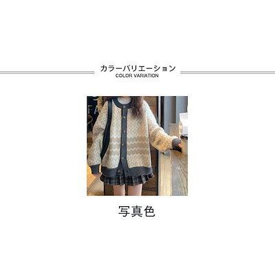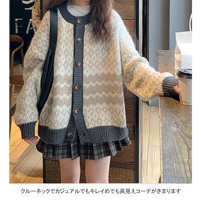 ニットカーディガン レディース アウター 配色 クルーネック 長袖 前開き ボタン 柔らかい ゆったり 着回し 大人可愛い 春秋