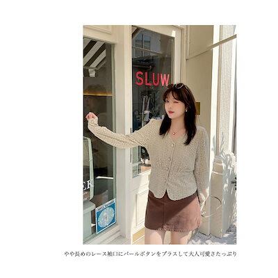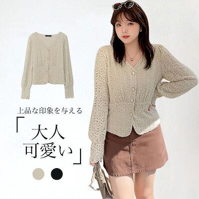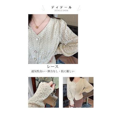 カーディガン レディース ショート丈 レースカーデ トップス アウター レース柄 前開き 長袖 Vネック 透かし ボタン付き お洒落 ゆったり カジュアル