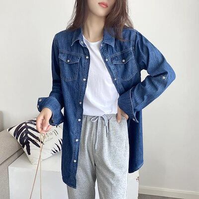 レディース トップス デニムシャツ ウエスタンシャツ 綿デニム スナップボタン ロング丈 テッチ 大きいサイズ ウエスタン シャツ ウォッシュ ヴィンテージ