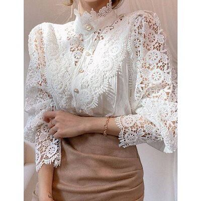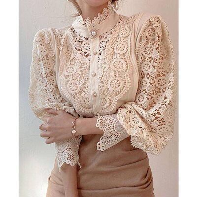シャツブラウス 長袖 立ち襟 バルーンスリーブ レース ボタン レディース トップス 大きいサイズ ゆったり 上品