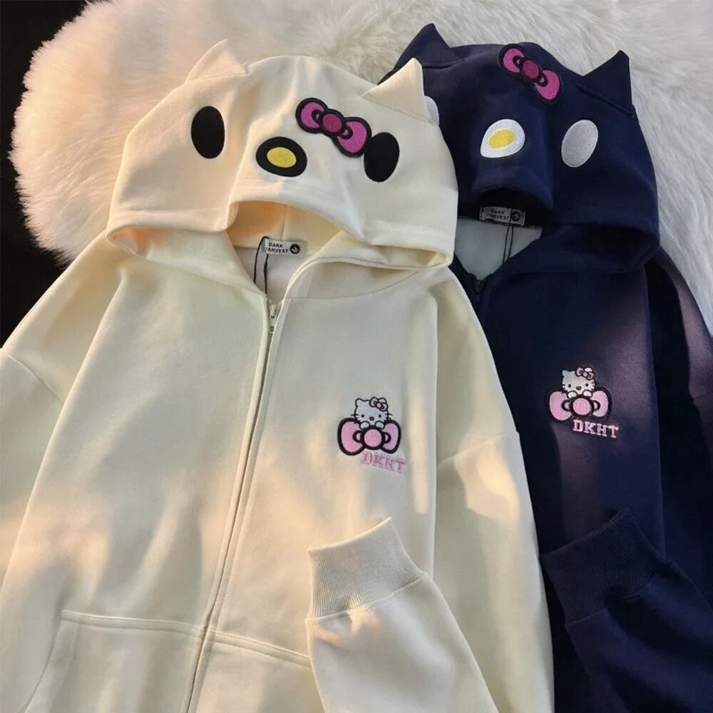 女性のためのハローキティ刺zipジップパーカー、アメリカのヴィンテージかわいい大学スタイル、カップルコート、ルーズストリートウェア、怠惰なカジュアルな2kトップス ボトム ワイドレッグ バギーパンツ T240901070134_02