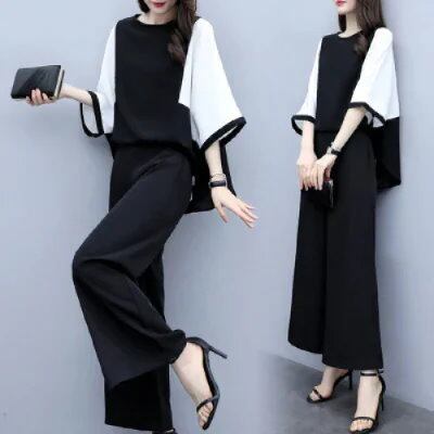 二点セット人気新作春夏服レディースセットアップ コントラストカラー切り替えトップスワイドパンツおしゃれカジュアル大きいサイズ韓国ファッション上下セット