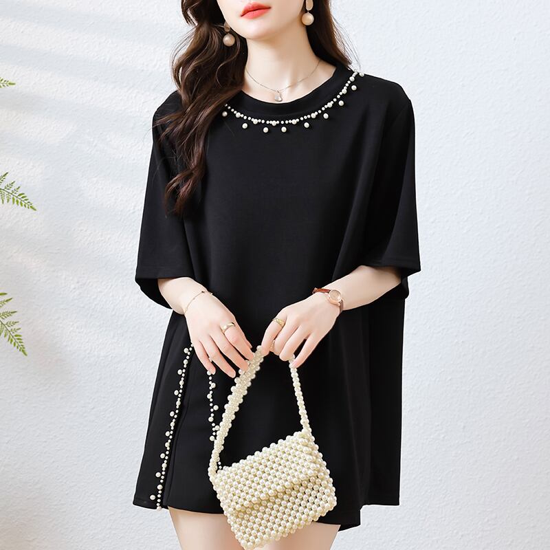 初回送料無料 夏のTシャツ 半袖のビーズ付き中長上着 ゆったりサイズブラウス 人気