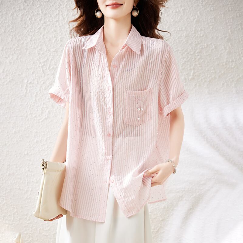 初回送料無料 半袖シャツ上着 ストライプトップス レディースファション商品 カジュアル上着 人気
