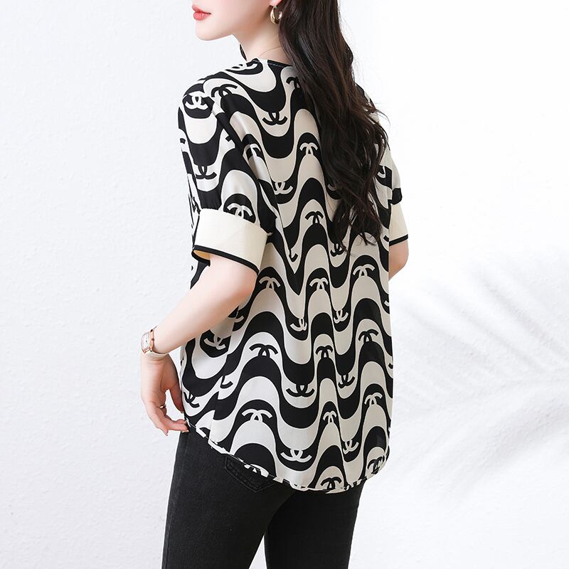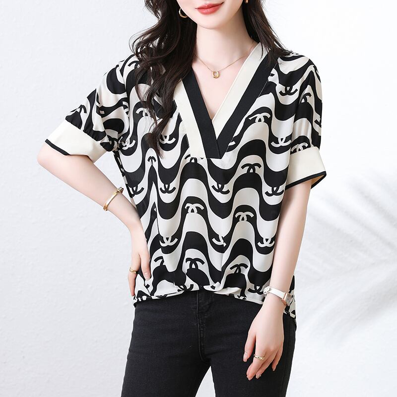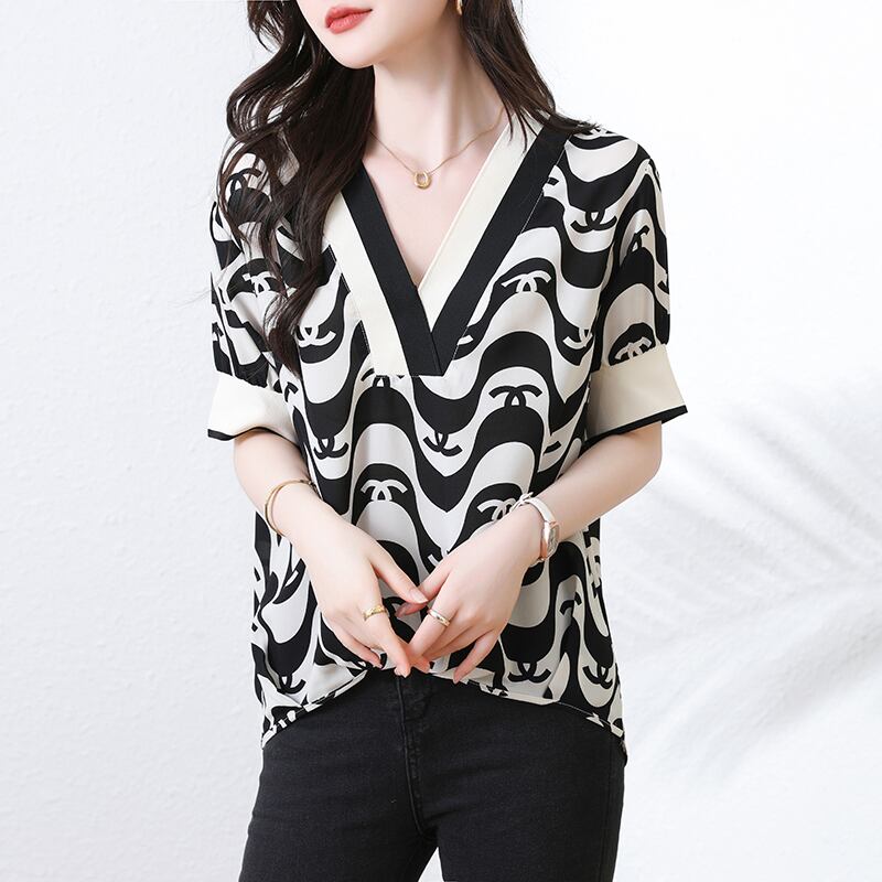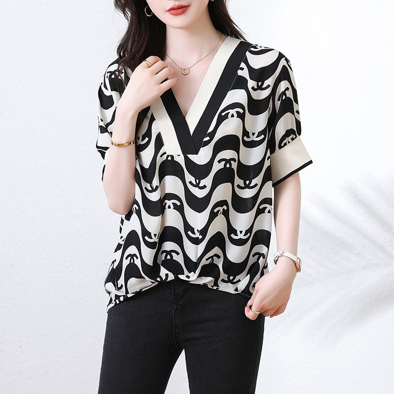初回送料無料 半袖上着 シフォンvネックプリントストライプトップス レディースファション商品 人気