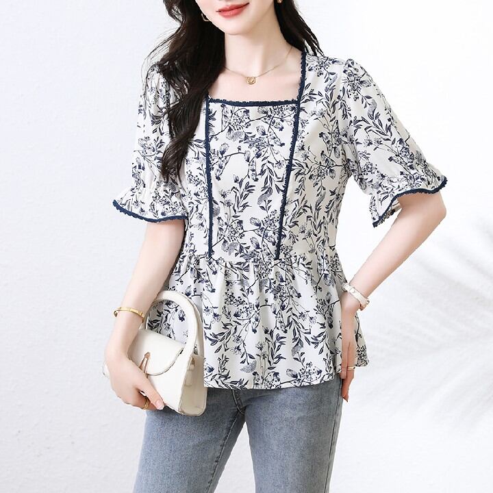 初回送料無料 半袖上着 シフォンレース付き プリントトップス レディースファション商品 人気ブラウス