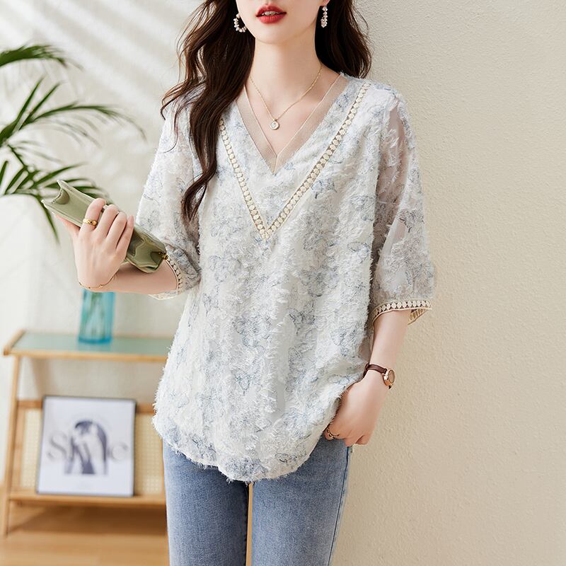 初回送料無料 半袖シャツ 上着 シフォン vネックプリントトップス レディースファション商品