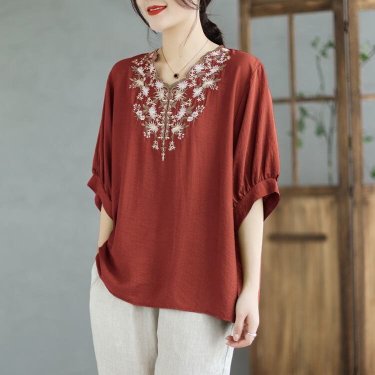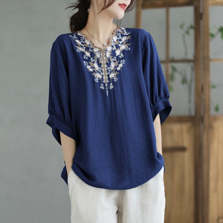 初回送料無料 上着 半袖刺繍vネックTシャツ ゆったりサイズブラウス レーディスファション商品