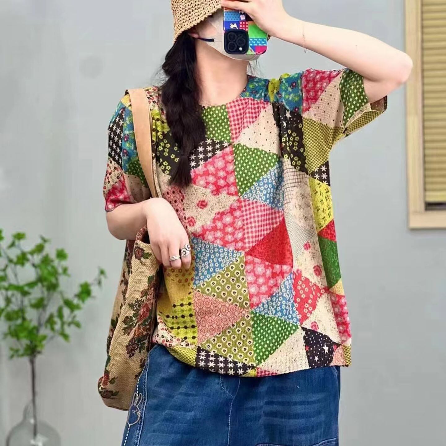 初回送料無料 プリント涼しいニットトップス 半袖クルーネック レディースファション上着 人気商品