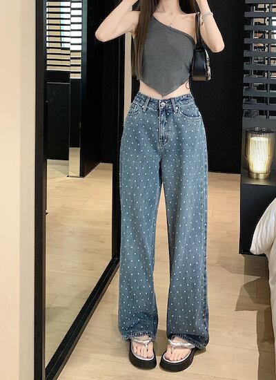 2024春夏パンツ デニム ジーンズ ドット柄 ワイド ストレート ハイウエスト 脚長効果 美脚効果 細見え 春 カジュアル おしゃれ かわいい 韓国ファッション レディース お出かけ