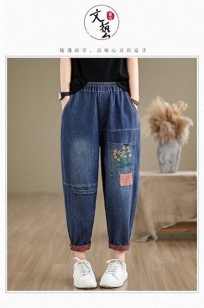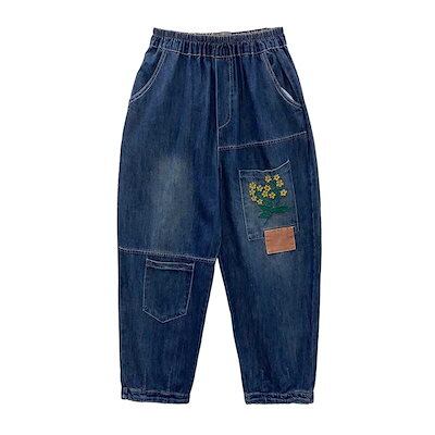 「ファットガール」 夏 刺繍 デニムパンツ ジーンズ ゴム 九分丈 薄手 ワイドパンツ デーパードパンツ 体型カバー 大きいサイズ ゆったり レディース