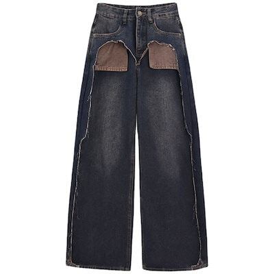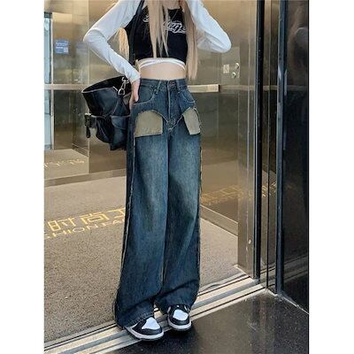 2023新型デザイン感突撃色ポケット外反継ぎ手ジーンズレディースラージサイズハイウエストスリムストレートワイドパンツ
